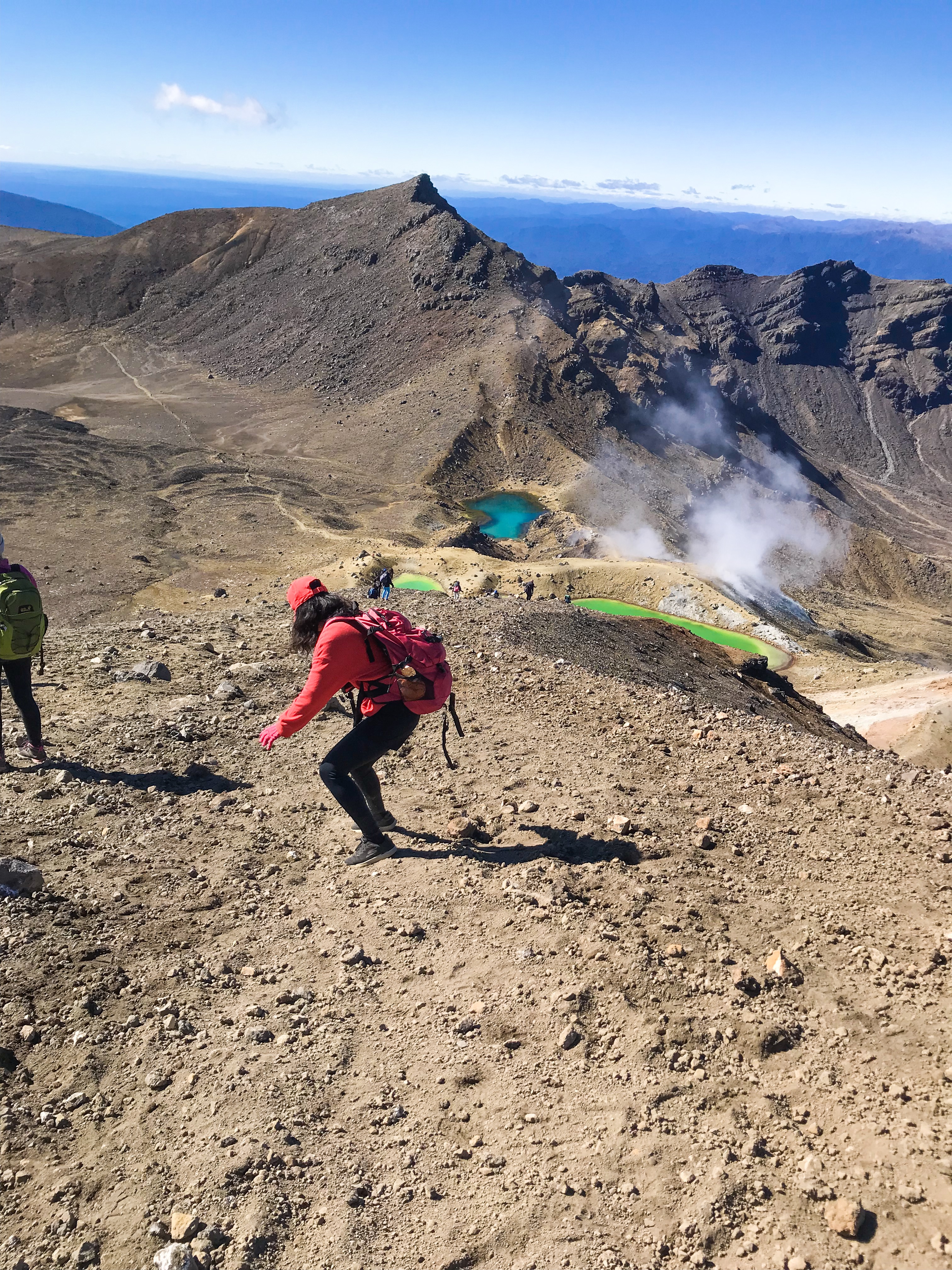 之後往前走就可以看到美麗的藍湖及綠湖,但要走到這兩座湖邊又是一個考驗,必須走一段超斜的碎石路,在這段路行走根本沒有形象可言,大家姿勢一個比一個醜,我在這段路總共滑倒四次,屁股快痛死了!