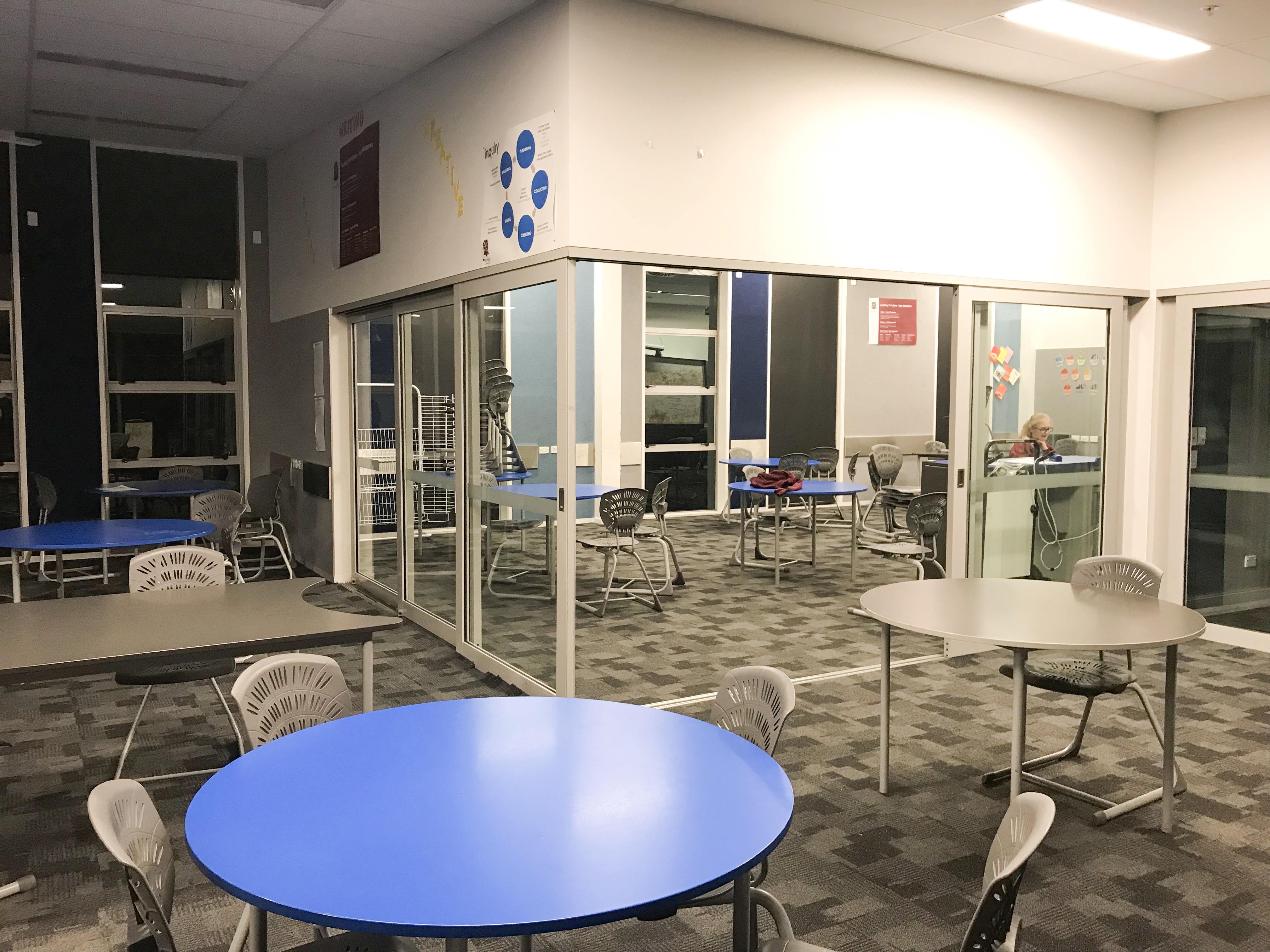 而且上課沒有固定教室,要上什麼課學生就移動到什麼教室,更特別的是還看到一個空間分成三間教室,中間只有落地窗隔著,我問這樣上課不會互相干擾嗎?她說會,其實上課蠻吵雜的!